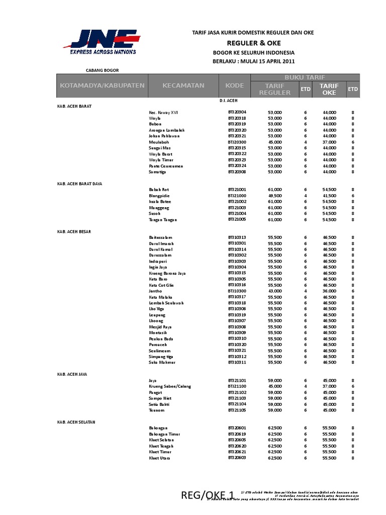 Daftar Tarif Ongkos Kirim Jne Regular Lengkap Dari Jakarta Untuk Titipan Kilat Toko Online Anda