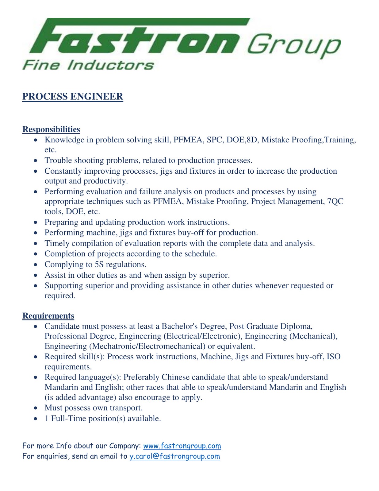 Official Career Job Info And Opportunity Mechanical Eng Usm Job Vacancy At Fastron Group Penang