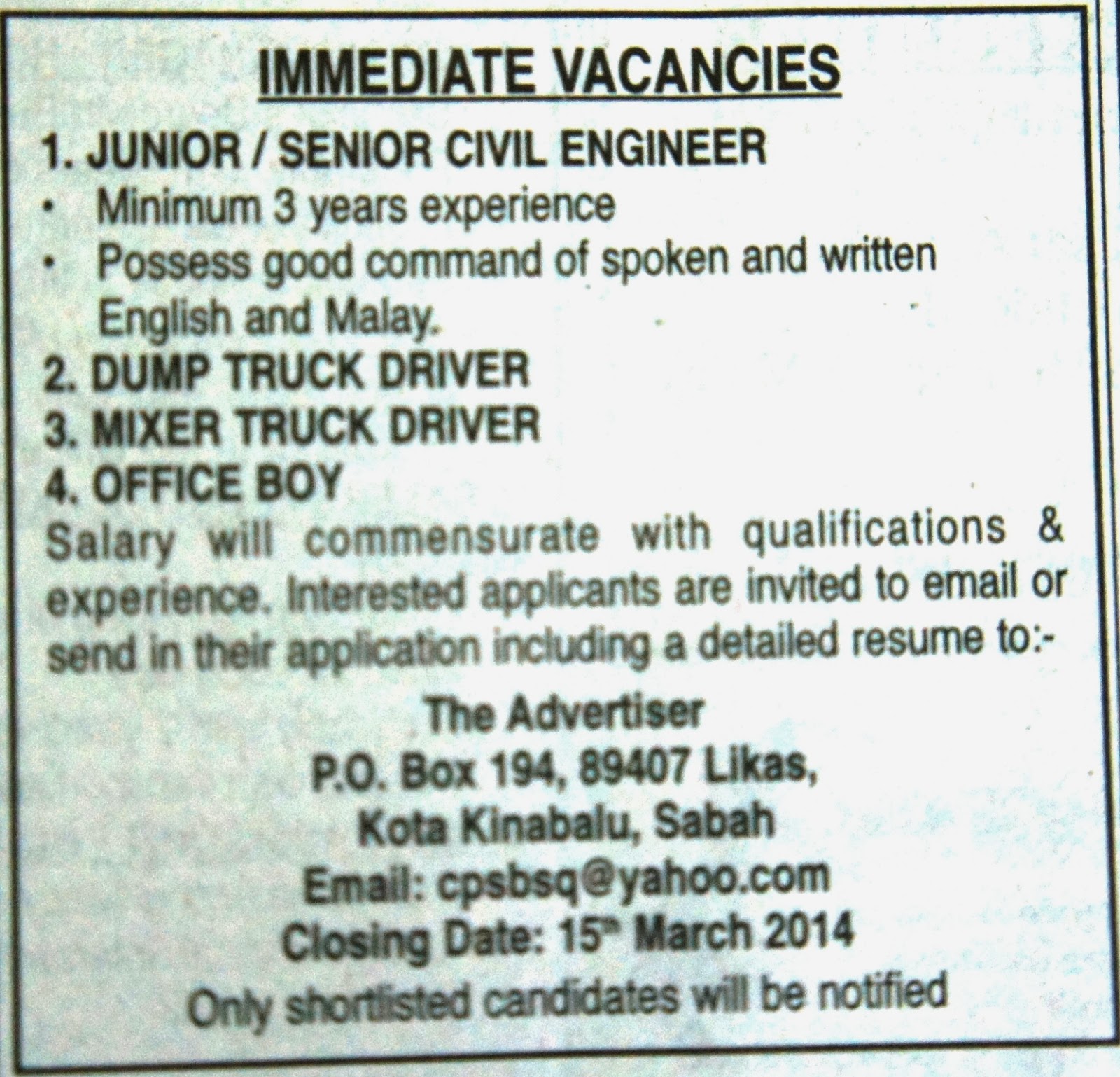 Job Vacancy In Sabah Multiple Vacancies Kota Kinabalu Junior Senior Civil Engineer Dumb Truck Driver Mixer Truck Driver Office Boy
