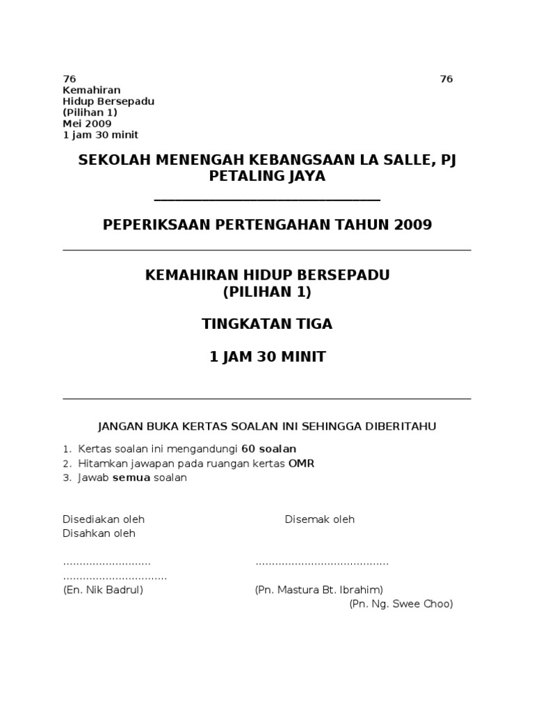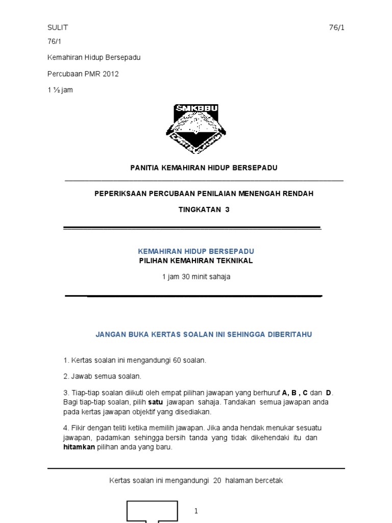 Sulit 76 1 Kemahiran Hidup Bersepadu Percubaan Pmr 2012 1 Jam