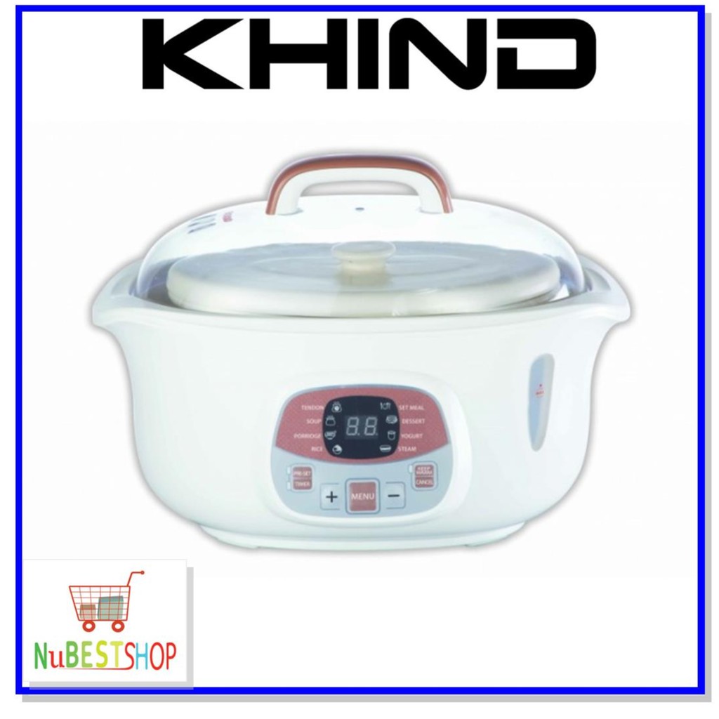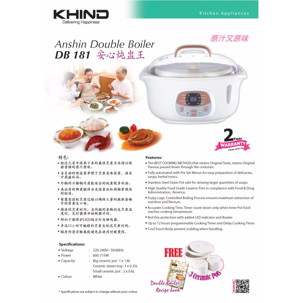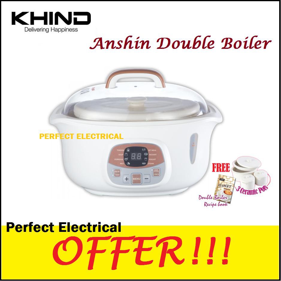 Khind double boiler db181. Khind double boiler series db 601 is really a great kitchen ware where each of a family should really own one. Big ceramic 1 x 1 8l. It save alot of cooking time and perhaps effort in order to prepare a delicious and nutritionous meals for all the family members. The khind anshin double boiler is fully automated with preset menus in order for easy preparation of delicacies soups and herbal tonics.