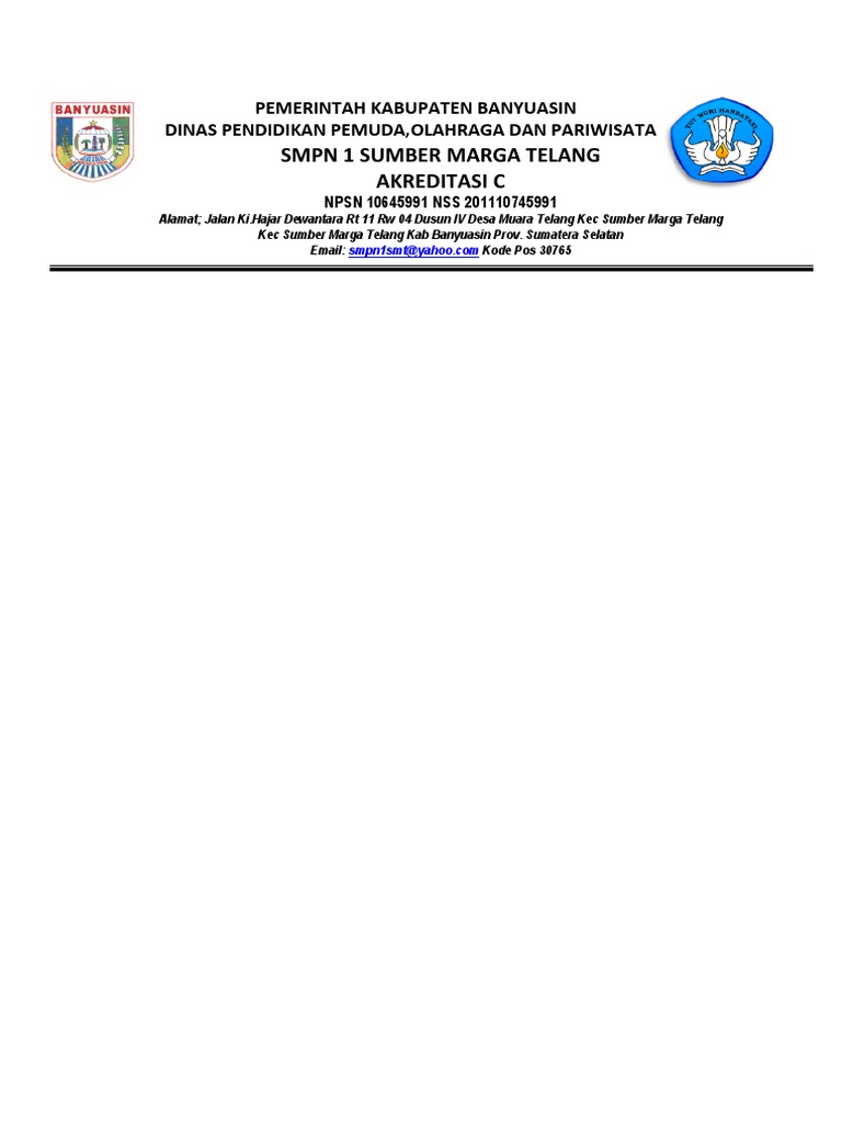 Smpn 1 Sumber Marga Telang Akreditasi C Pemerintah Kabupaten Banyuasin Dinas Pendidikan Pemuda Olahraga Dan Pariwisata